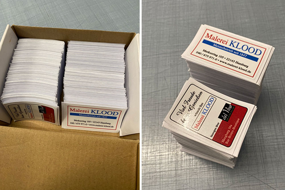 Außerdem stellen wir Aufkleber in unterschiedlichen Größen und Stückzahlen her. Auch im Visitenkartenformat sind die Drucke noch in gestochener Qualität.